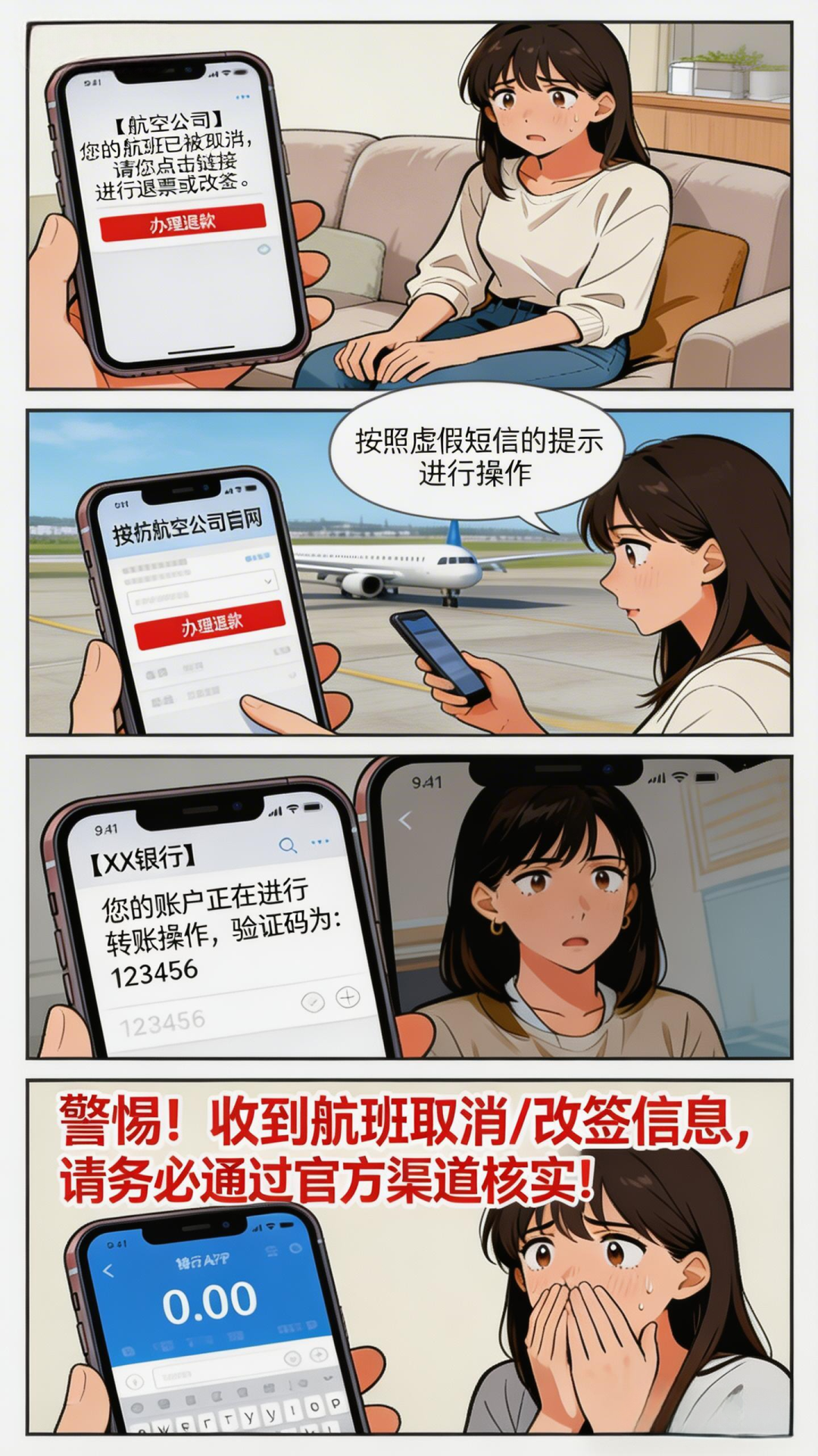 2. 改签电话、短信和链接 实则暗藏电诈风险 如果收到 “航班取消/改签”的短信 并附带网页链接 请直接拨打 航空或者铁路公司的官方电话 进行核实 勿轻信任何短信!