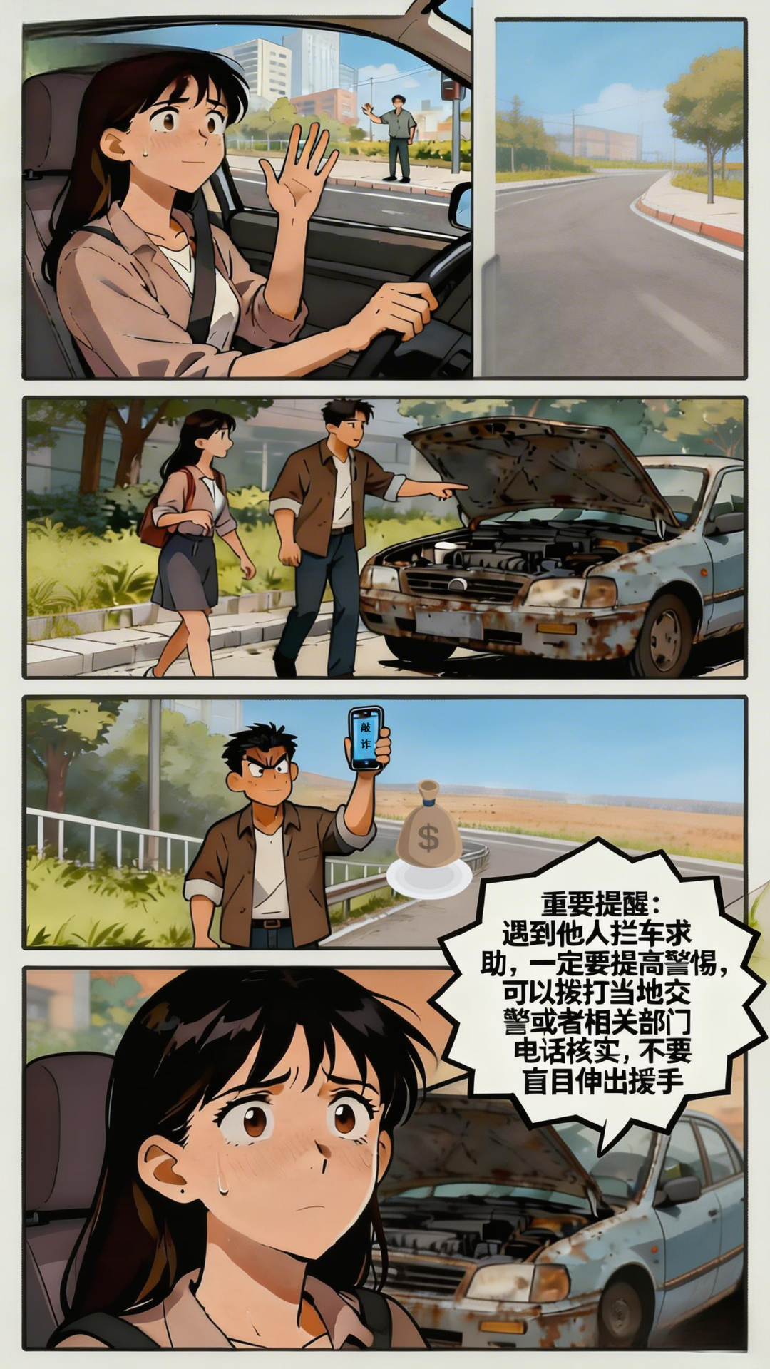 3. 自驾路遇本地人招手拦车 背后藏着勒索真面目 自驾途中 路遇陌生人或者本地人招手拦车 一定要提高警惕 可以拨打当地交警或者 相关部门的电话进行核实 切勿盲目伸出援手