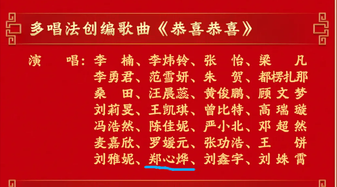 表演时 郑心烨和其他队员一起 用几近完美的表现 以喜庆的旋律点燃了晚会现场的氛围 向全国人民送上最诚挚的新春祝福