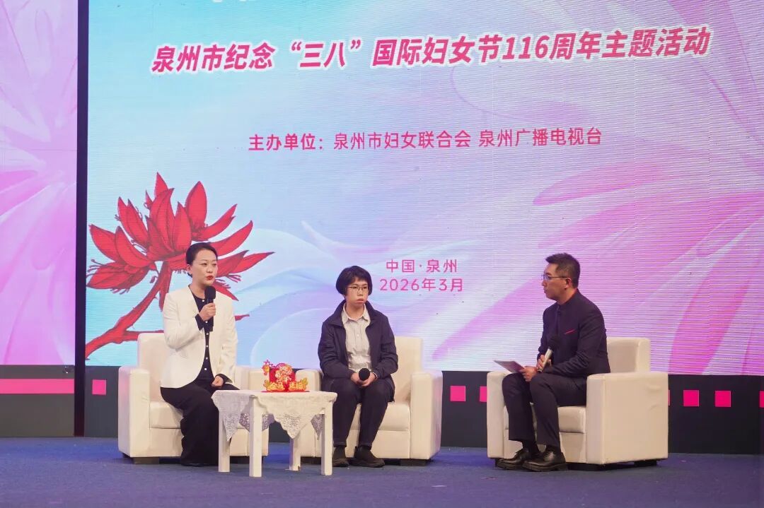 活动现场,省“最美女科技工作者”王冬玲,德化县唐硕陶瓷有限公司负责人高翠华,“海丝文旅推荐官”颜静怡,泉州圣源警用侦察设备有限公司董事长庄碧丹,晋江皇嘉家电商贸有限公司副总经理杨幼棉,市女企业家协会理事、泉州禾伦织造有限公司副总经理张盈盈,市女企业家协会副会长、理想实业执行董事王美丽,惠安县云想农业科技公司总经理、八闽巾帼直播基地“惠岸明珠”等农业品牌创始人蔡喃喃等8位女性代表分别从“她”力量点亮产业数字化转型、“她”在“AI时代”中的产教融合、“她”用智造温度点亮家庭、“她”把智造种子播撒在乡野沃土等方面做了精彩访谈,并向全市妇女发出擘画“十五五”的蓝图倡议,全面展示新时代泉州女性昂扬向上、奋发有为的精神风貌,激励全市广大妇女在中国式现代化泉州实践中勇担使命,在“十五五”新征程上再立新功。