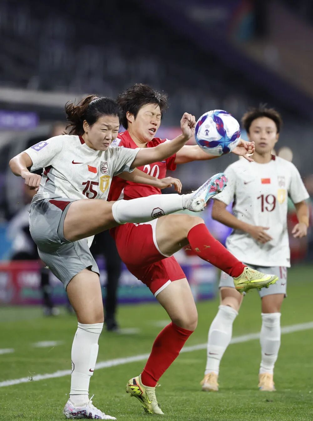 中国队球员王爱芳(左)和朝鲜队球员蔡恩英(中)在比赛中拼抢 丢球仅仅两分钟后,中国队便迅速给出回应。王霜在左路开出角球,后点的张睿头球摆渡,邵子钦巧妙回作,拍马赶到的边后卫陈巧珠左脚劲射画出优美的弧线直入右下角,为中国队扳平比分。上半场进入伤停补时阶段,姚伟在前场左侧开出任意球,朝鲜队造越位失败,后点的张程雪将球敲到门前,王霜轻松推射空门得手,助理裁判第一时间示意越位,但主裁判经VAR提示后确认进球有效,中国队在半场结束前反超比分。