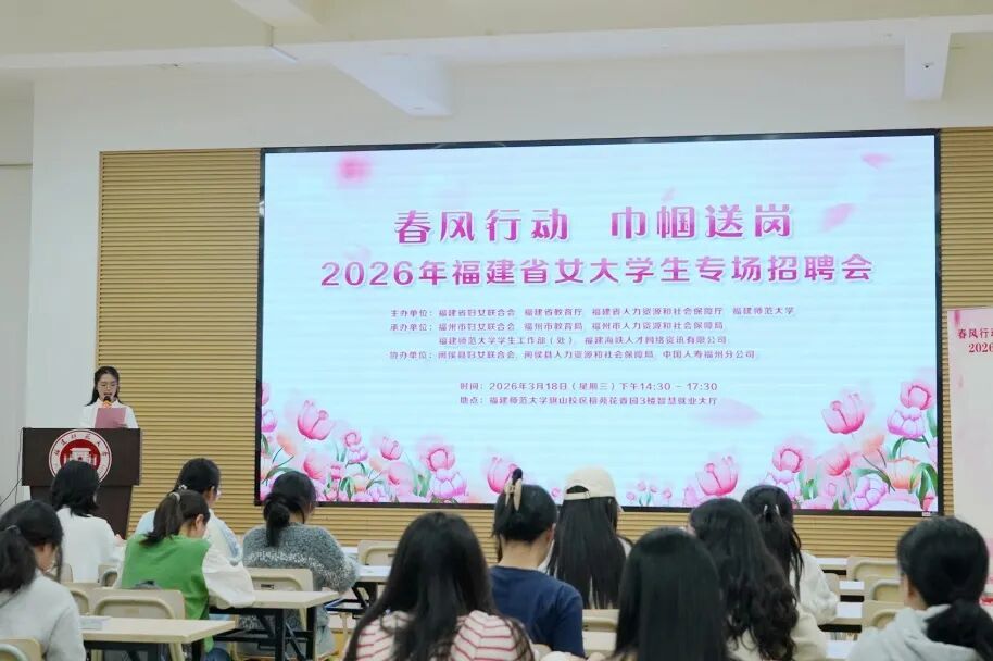 春日的校园,暖意融融 3月18日 福建师范大学旗山校区 迎来一场特别的职场之约 由福建省妇联、省教育厅、省人社厅、福建师范大学主办,福州市妇联、市教育局、市人社局、福建师范大学学生工作部(处)、福建海峡人才网络资讯有限公司承办的“春风行动・巾帼送岗”2026年福建省女大学生专场招聘会成功举办,为女大学生们送上专属就业机遇。福建省妇联党组成员、副主席卓晓銮,省人力资源和社会保障厅二级巡视员刘澍,福建师范大学副校长陈晓斌以及教育厅学生处相关负责人到场指导,与企业招聘人员、求职学生亲切交谈。 “数”说现场