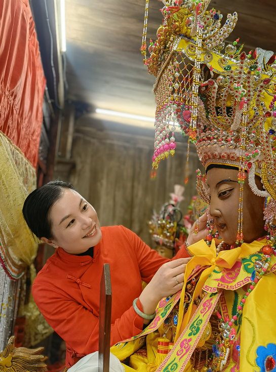 李少霞为妈祖金身梳妆打扮 结缘妈祖入职祖庙 李少霞出生于湄洲镇莲池村,是土生土长的湄洲人。小时候,她常常跟随大人朝拜妈祖,耳濡目染中,她对妈祖多了一份不一样的情怀。她笑称,那时候,觉得妈祖就是家里的亲人,一位长辈。 高中毕业后,李少霞考上了一所旅游中专,离开了湄洲岛。毕业前她回到湄洲,在一家台资酒店接待处实习。实习期间,她常常陪着客人拜谒妈祖,为客人讲解祖庙的由来和妈祖的传说,渐渐地在妈祖敬仰者中有了一定的知名度。 1997年10月,李少霞怀着对妈祖的敬仰与对家乡文化的深情,入职湄洲妈祖祖庙。从踏入祖庙的那一刻起,她便深知,这里不仅是海内外妈祖敬仰者朝圣祈福之地,更是承载中华优秀传统文化、联结两岸同胞情感的重要载体。她从基础工作做起,认真研习祭典仪轨、悉心管护文物遗存、用心做好日常接待,在点滴积累中夯实根基,在躬身实践中坚守初心。