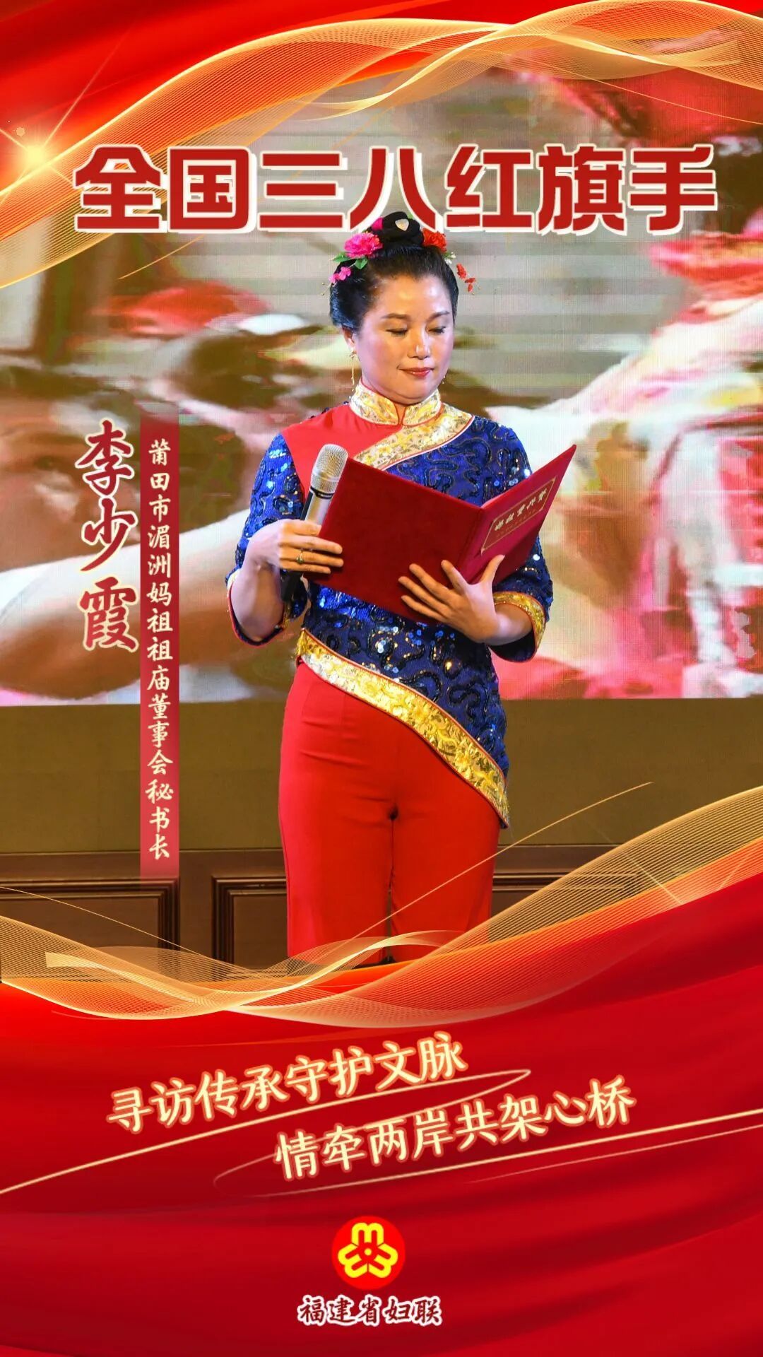 榜样如炬,向光而行 群芳奋进,八闽花开 她们,在灯火深处守护万家 在三尺讲台孕育桃李 在乡野田间耕耘振兴 在科研前沿潜心求索 每一个她,都在用自己的方式 为时代添一笔亮色 新程启航,逐梦奋进正当此时,闽姐姐特别开设“启新程·‘她’逐光”专栏,展播我省获评2025年度全国三八红旗手标兵、全国三八红旗手、全国三八红旗集体、全国巾帼文明岗先进典型。让我们循着“她”的足迹,感受八闽女性昂扬向上的精神风貌,激励更多姐妹在追光路上绽放最美芳华! 今天,跟着闽姐姐一起走近 全国三八红旗手 莆田市湄洲妈祖祖庙董事会秘书长 李少霞