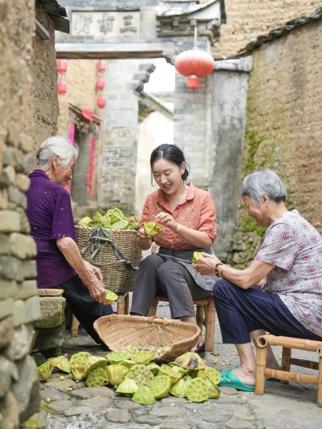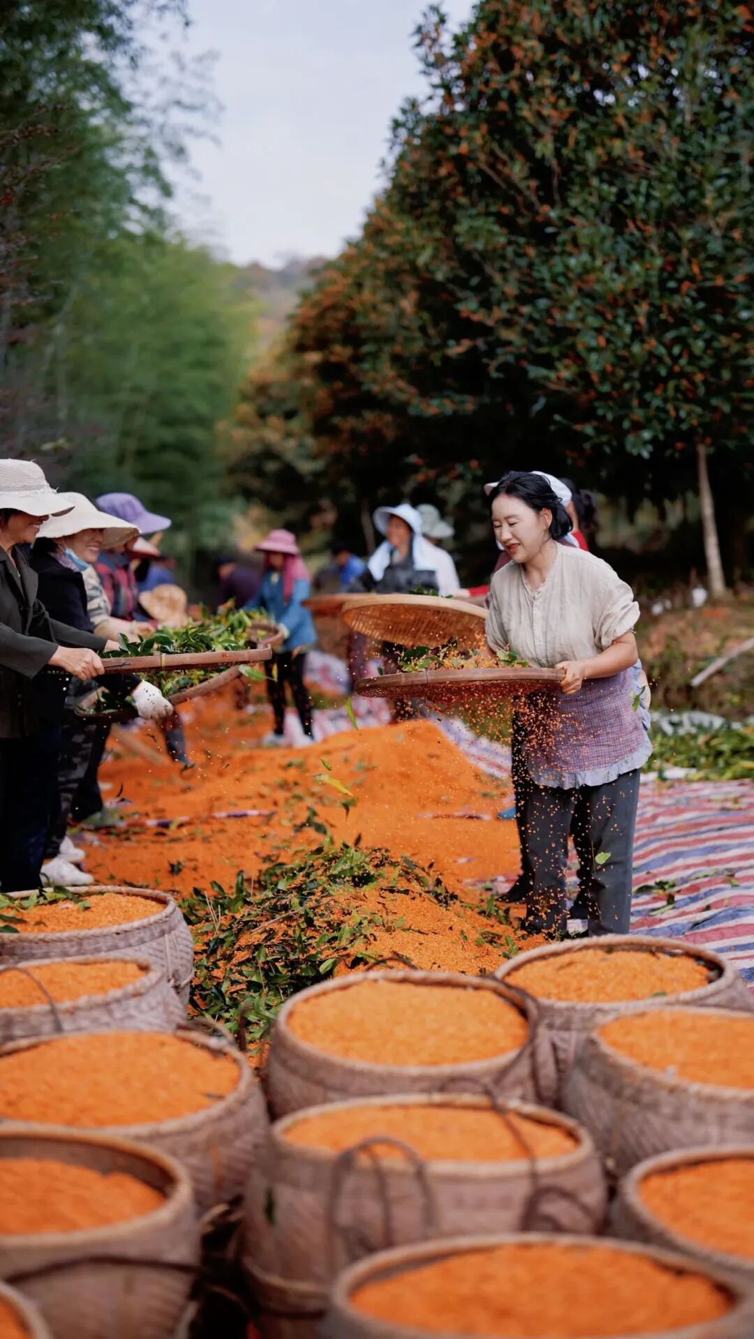 沈枝丹在浦城跟村民一起筛桂花 “要为乡村留下带不走的产业链。”沈枝丹介绍,目前她和团队已开发推出浦城桂花红茶、松溪百年蔗红糖等50多种特色农产品。