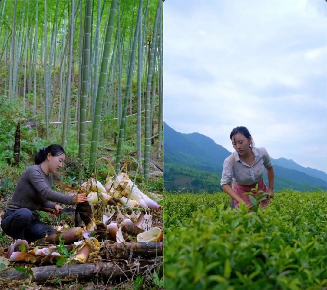 回村后,她习惯拿起手机记录生活,镜头里只有她劈柴、做饭、挖笋的身影。真实而又自然的乡村生活视频,在一众短视频中如“黑马”般脱颖而出。挥锄挖笋,剥去笋壳,溪边洗净,再将笋制成笋干、笋饼、笋肉煲,一桌饭菜蒸腾起乡村的烟火气……2021年春天,沈枝丹在自己的短视频账号上发布了一条以春笋为主题的视频,收获超200万播放量。