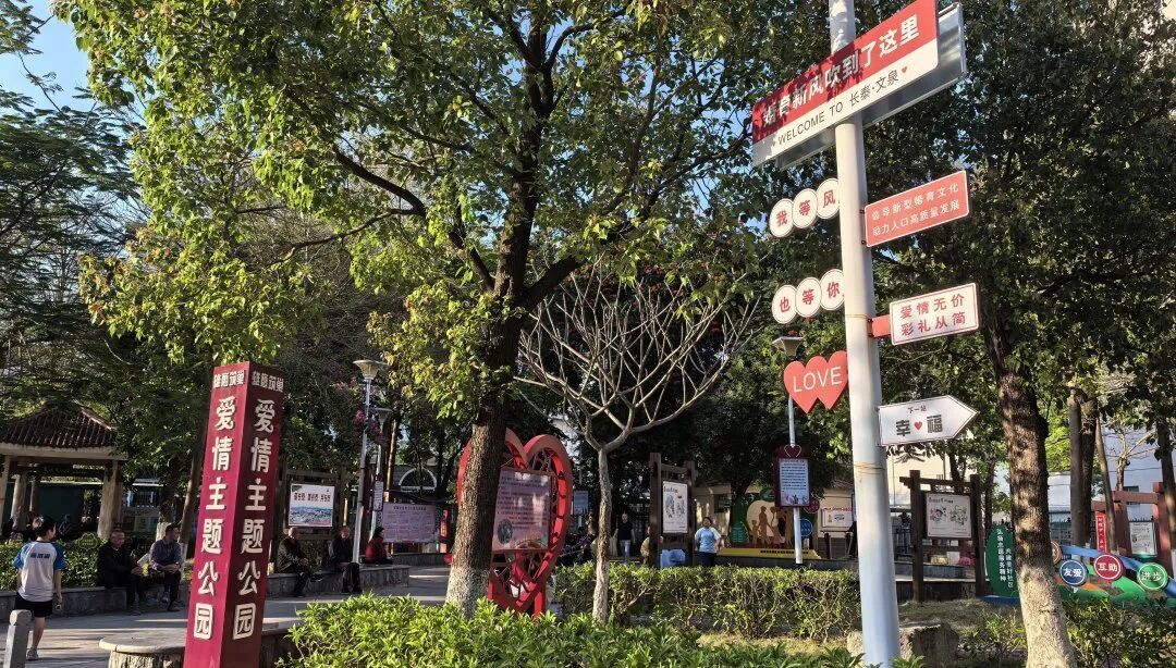 “以前觉得彩礼要少了没面子,现在社区里都流行‘零彩礼’‘低彩礼’,大家反而觉得这样才是真感情。”在漳州市长泰区武安镇文泉社区的“雄鹰筑巢”爱情主题公园里,正在散步的居民黄大爷笑着说。 这座占地约1000平方米的小公园,如今已成为周边4000多名居民家门口的“幸福地标”。而就在三年前,这里还是一处不起眼的小广场。 小公园里藏着“大文章” 2023年8月,文泉社区在区、镇两级支持下,把这里改造成了爱情主题公园。公园不大,但很用心——以“雄鹰一生一伴侣”的忠贞为象征,设置了爱心长廊、模范夫妻故事展板、雄鹰鸟巢等打卡点,转角还能“遇见爱”。