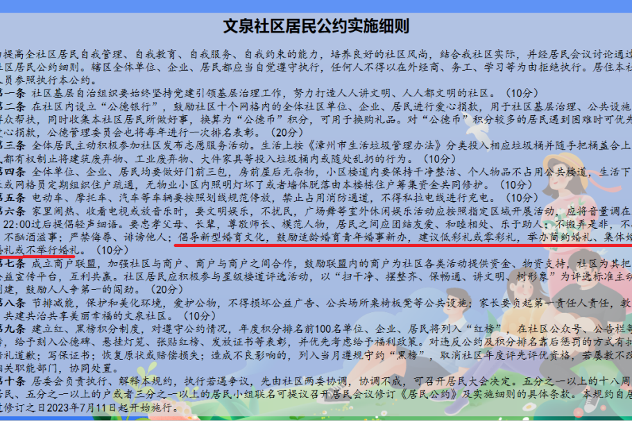 《文泉社区居民公约实施细则》 社区修订了《居民公约》,明确写入“低彩礼”“零彩礼”“婚事新办”等条款。更重要的是,这些新风尚在爱情公园里被一次次“活化”。 在公园新增的“婚育新婚打卡点”和“爱的约定”景观前,社区不定期组织青年男女开展“因为爱情,绘就幸福生活”主题活动,现场倡导低彩礼、零彩礼,反对借婚姻索取财物和盲目攀比。在七夕节重要节点,社区还在公园里评选金婚、银婚、钻石婚等模范夫妻,让他们用自己“风雨同舟半世纪,分文彩礼未曾取”的真实故事,告诉年轻人:幸福不靠金钱量,真情才是一生伴侣。