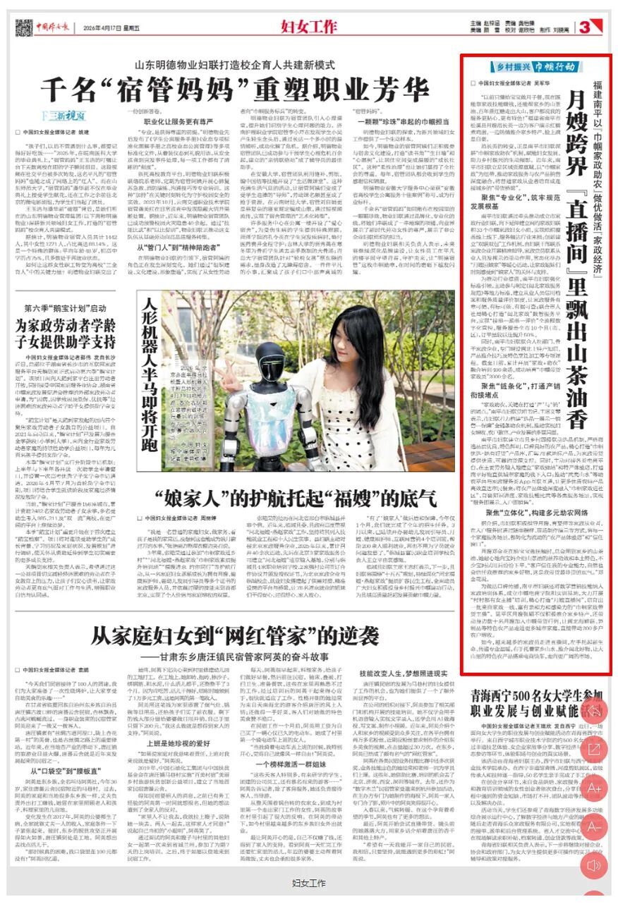 4月17日,《中国妇女报》报道福建南平以“巾帼家政助农”做优做活“家政经济”:月嫂跨界“直播间”里飘出山茶油香。